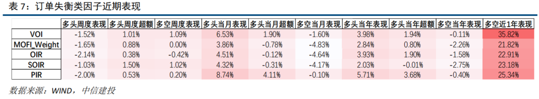 在订单失衡类因子中,本周VOI因子多空收益进展最佳,周度多空1.09%,多头逾额1.01%;本月PIR因子多空收益进展最佳,多空收益-0.10%,多头逾额4.11%;本年以来VOI因子多空收益进展最佳,多空收益-0.11%,多头逾额1.94%;近一年VOI因子多空收益进展最佳,多空收益35.82%。