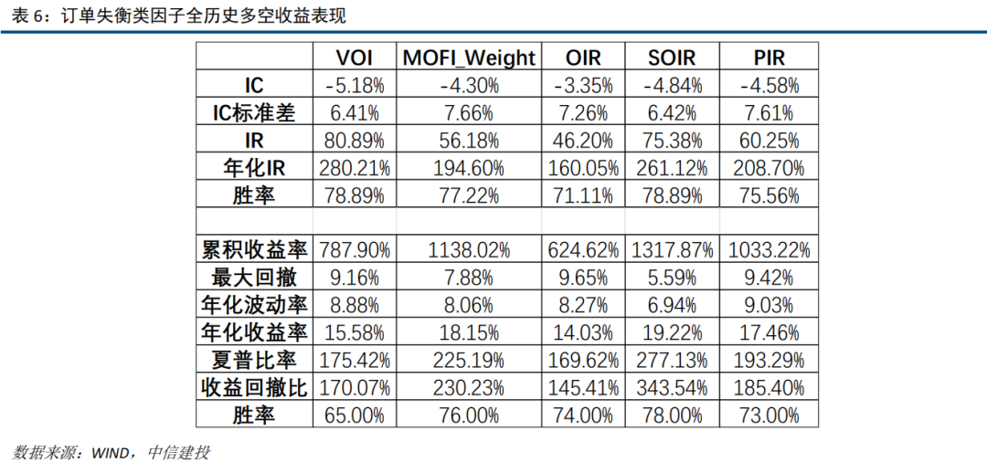 订单失衡因子全历史多空收益在14%-20%区间以内,其中,SOIR因子进展最佳,多空年化收益19.22%,夏普比率2.77,最大回撤5.59%,IC均值-4.84%,年化IR达到2.61。